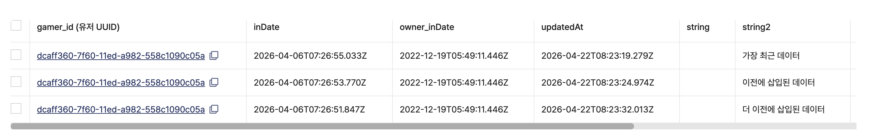 - 로그인 후 게임 종료까지 세션 동안 미리 캐싱한 inDate값으로 데이터를 관리(저장)