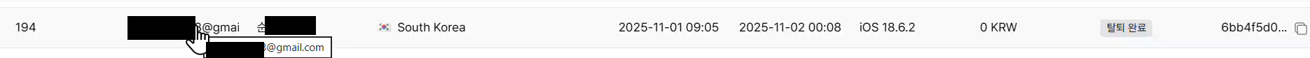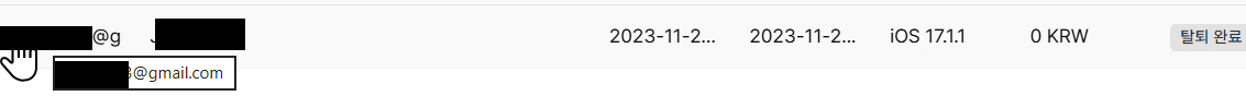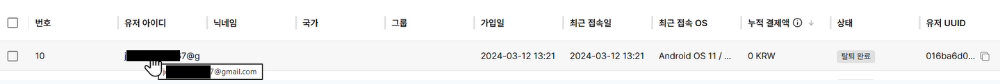 뒤끝 콘솔에서 탈퇴완료된 회원으로 필터링하면 목록에는 탈퇴완료가 오랜기간 지난 회원의 이메일주소가 노출되고