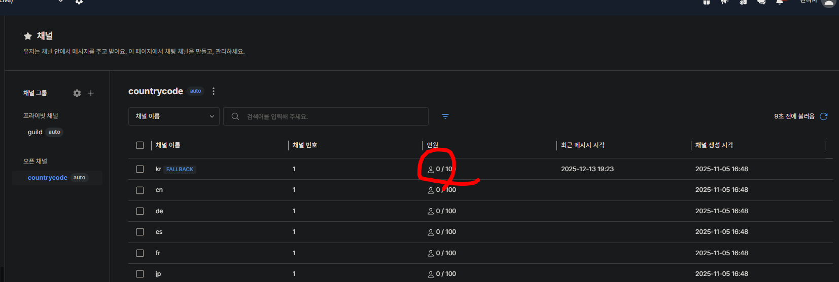 그러면 아래 상태일때 kr채널에 인원이 100명 가득 차면 새로운 채널이 자동으로 생성 될까요?