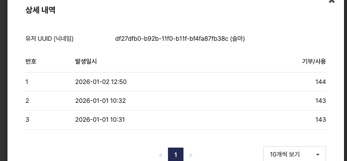 추가적으로 확인해보니 기부량 자체는 잘 쌓이고 있으나 합산이 되지 않고 있는거 같습니다.