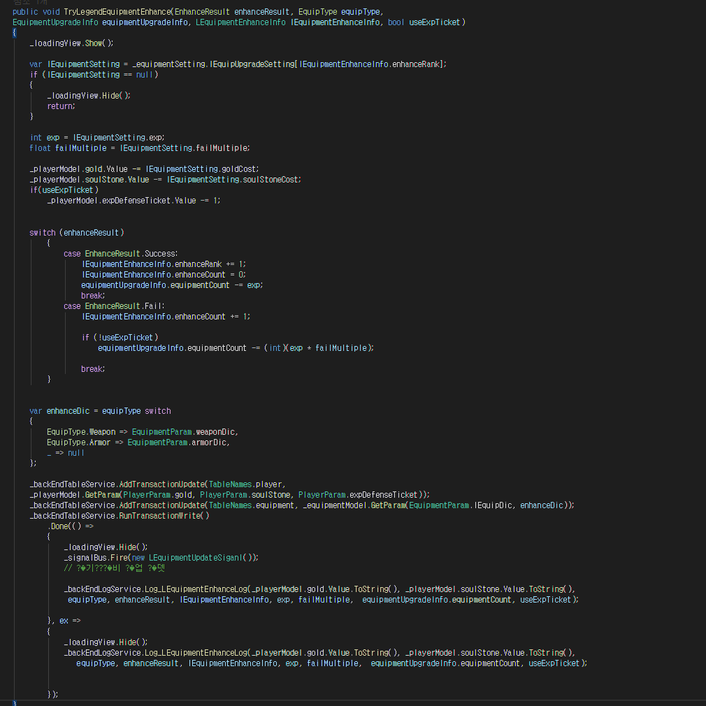 뒤끝 행동유형은 LEquipmentEnhance입니다. 추가로 코드도 올려놓겠습니다.