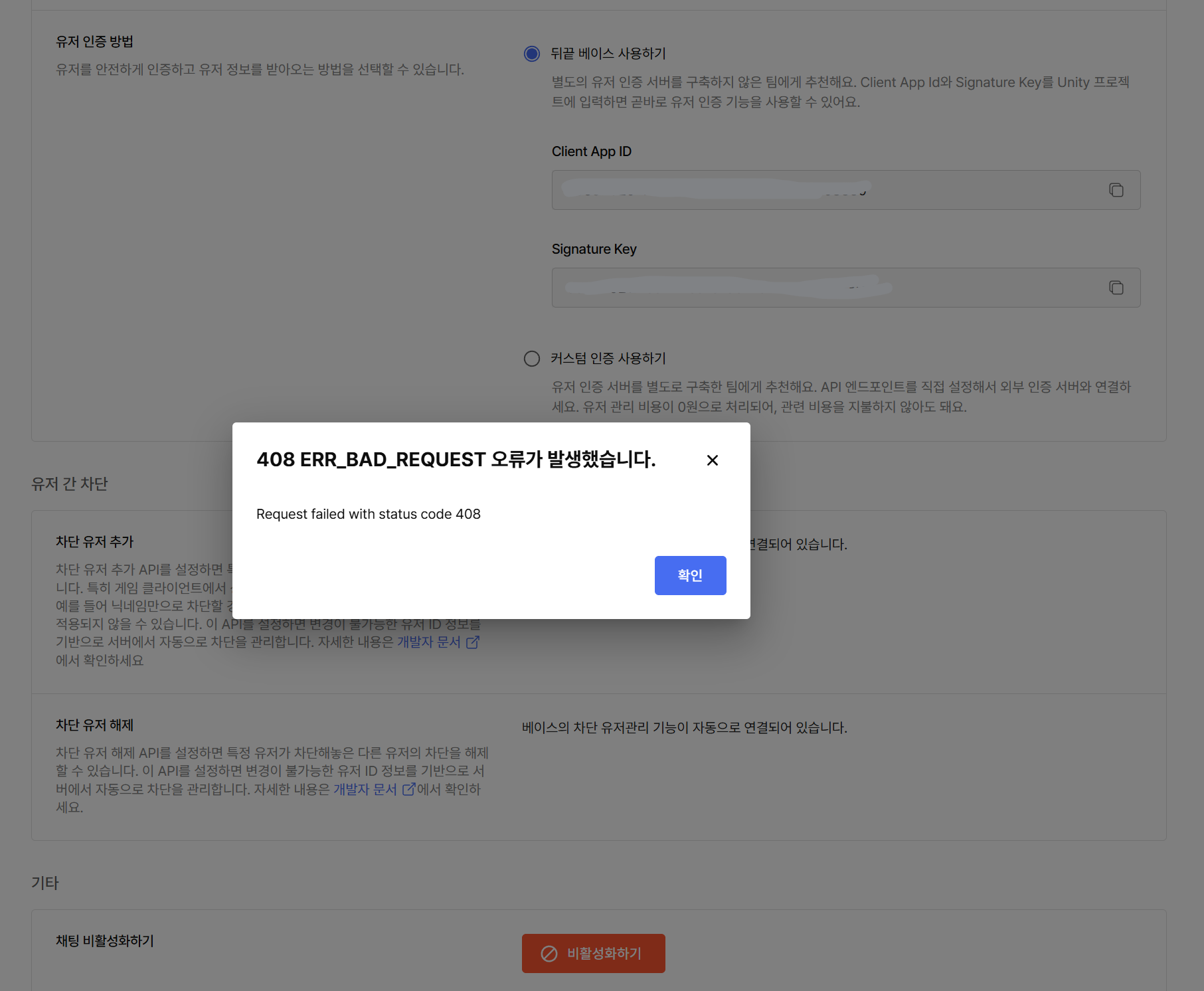 안녕하세요. 채팅 사용량이 없어서 비활성화하려는데 408 ERR BAD REQUEST 오류가 발생합니다.