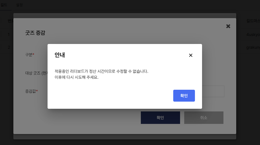 테스트를 위해서 콘솔 상에서 길드에 길드 굿즈를 증감을 시도해봤는데, 리더보드 정산 시간이라고 수정이 안됩니다.