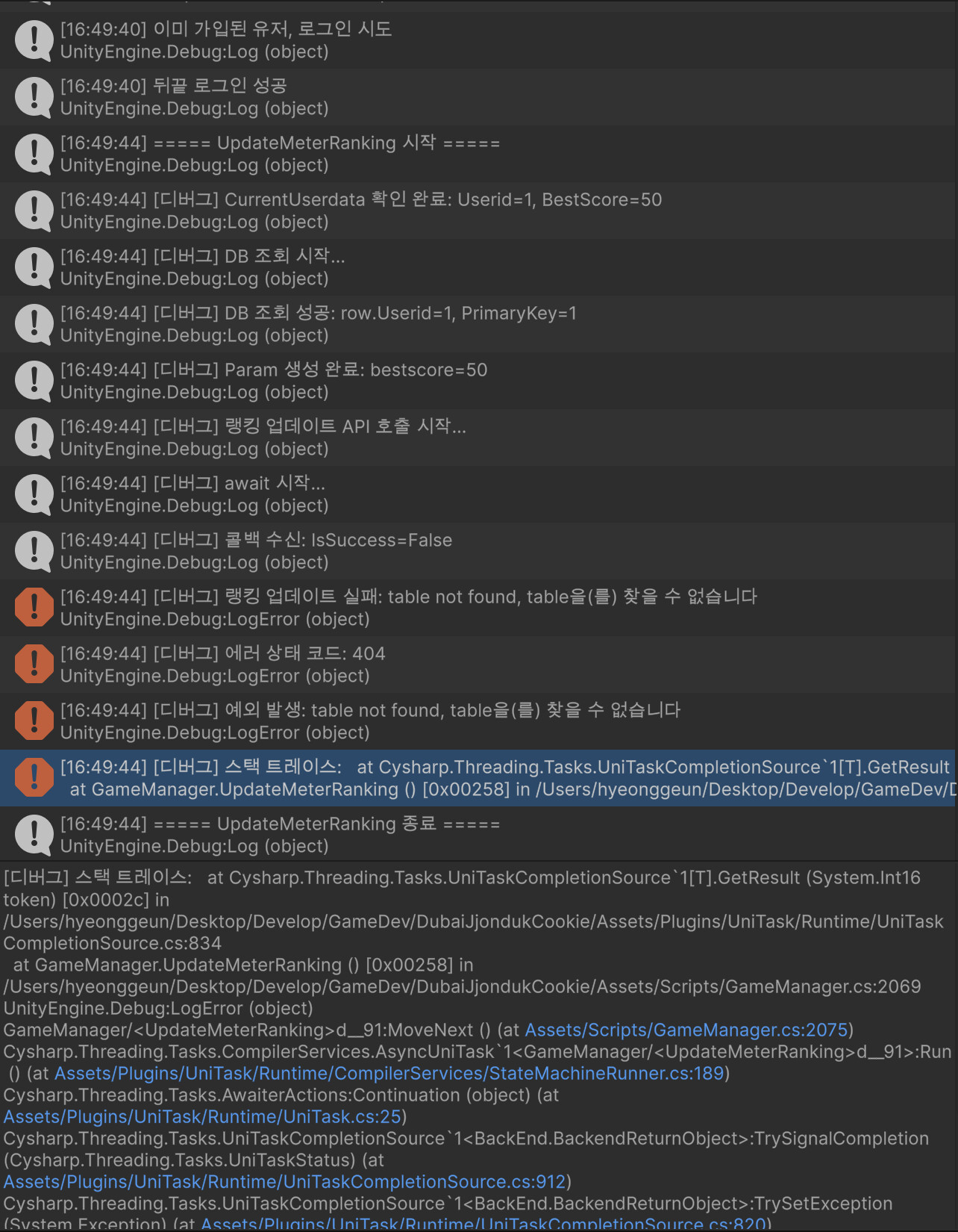 Debug.LogError("랭킹 업데이트 실패: " + e.Message);